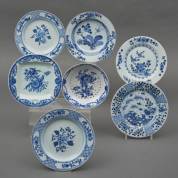 Zes Chinees porseleinen borden, en fruittest met blauw-witte florale decors, 18e/19e eeuw -defecten-, 2,5 x Ø 23 cm