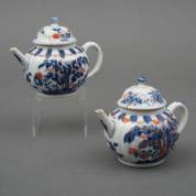 Paar Chinees porseleinen Imari theepotjes met geribbelde buik, 18e eeuw -deksels gelijmd, haarlijnen-, 12 x Ø 14 cm