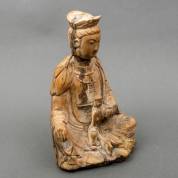 Chinees houten Guanyin met resten van polychromie -ketting in hand afgebroken, krimpscheuren-, 25 x 33 x 15 cm