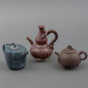 Twee Yixing trekpotjes waarvan een in vorm van een paprika, beide gemerkt, daarbij: een roodgeglazuurd trekpotje met oor in de vorm van een hagedis, 20e eeuw, 13,5 x 13 x 9 cm
