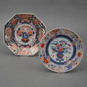 Japans porseleinen Imari bord en achthoekig dubbelbord, beide met bloemenvaasdecor, 18e eeuw, 4,5 x Ø 28,5 cm