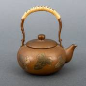 Japans koperen kyusu theepot met bladmotief en rieten hengsel, gemerkt Gyokusendo, midden 20e eeuw, 13 x 12 x 10 cm