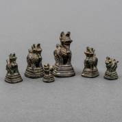 Serie van zes bronzen opiumgewichten in de vorm van Toe, een mythisch wezen half leeuw en half paard, Birma, 20e eeuw