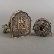 Twee koperen en wit metalen reisaltaartjes, Sino-Tibetaans, 3 x Ø9 cm