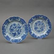 Paar Chinees porseleinen borden met accoladerand, het blauw-witte decor met bloemen en attributen, 19e eeuw -één bord gekramd, randschilfers-, 2,5 x 23,5 cm