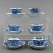 Zes gelijkende Chinees porseleinen achthoekige kommetjes en schoteltjes met blauw-wit bloemdecor, 19e eeuw -kleine randschilfertjes, één kopje gelijmd-, Ø 10 cm