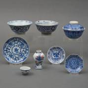 Chinees porseleinen capucijner schoteltje met blauw-wit floraal decor, Imari miniatuur kastvaasje -deksel ontbreekt-, twee kleine schoteltjes, kommetje, bedekte kom met vogeldecor, en twee kommen met floraal decor -defecten-, 10 x 11,5 cm