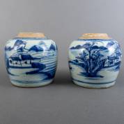 Twee Chinees porseleinen gemberpotten met blauw-wit landschapsdecor, 19e eeuw, 17 x Ø17 cm