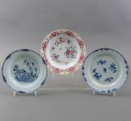 Drie diverse Chinees porseleinen borden: blauw-wit bord met bloemdecor -chips-, famille rose diep bord, blauw-wit diep bord met tuindecor, alle Qianlong, Ø 24 cm