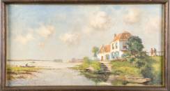 Arend van der Pol (1886-1956), dijkhuis aan het water, marouflé, r.o. gesigneerd en gedateerd '36, 37 x 72 cm
