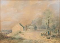 Hollandse School: enkele figuren bij een huisje aan een landweg, aquarel op papier, niet gesigneerd, 19e eeuw, 23 x 31 cm
