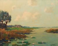 Gerardus Johannes Delfgaauw (1882-1947), polderlandschap met waterlelies, olieverf op doek, r.o. gesigneerd met pseudoniem H. v. Gessel -craquelé-, 39 x 49 cm