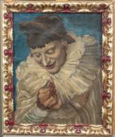 Schilderij: pierrot met druiventros, marouflé, niet gesigneerd, 20e eeuw -, marouflering laat los, verfverlies, witte verfspatjes-, 48 x 38 cm