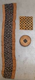 Raffia weefsel met geometrisch decor, raffia wandkleed met opgewerkt geometrisch decor versierd met kaurischelpen, en mand van plantaardig materiaal met geometrische motieven, Kuba, Democratische Republiek Congo, 2e helft 20e eeuw -gebruikssporen-, 270 x 50 cm