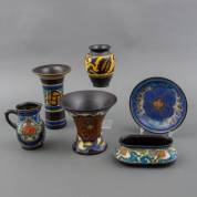 Divers plateel, waaronder vazen, schenkkan, jardinière, en schaaltje op voet, alle uitvoering Koninklijke Plateelbakkerij Zuid-Holland, Gouda, 21,5 x 14 cm