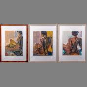 Hollandse School: drie keer vrouwelijk naakt, gouache op papier, tweemaal gesigneerd Hurk, jaren '90 -lichte vochtschade-, 56 x 42 cm