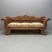Koloniale hardhouten bank met rotan zitting en rugleuning, 19e eeuw -defecten in rotan-, 92 x 225 x 65 cm