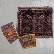Perzisch kussenfront Belouche, Perzisch tapijtfragment Afshar, en Perzisch kelimfragment Shasavan, 85 x 80 cm