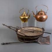 Gekuipte mahonie jardinière met zinken binnenbak, -mahonie defect- daarbij: koperen appelketel, messing ketel, en smeedijzeren haardstel