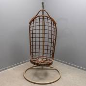 Bruingebeitste rotan hangstoel aan metalen staander, hangstoel jaren '70, staander mogelijk modern -gebruikssporen-, 197 Ø105 cm