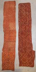 Twee rood-bruine raffia wandkleden met opgewerkte geometrische motieven versierd met kaurischelpen, Kuba, Democratische Republiek Congo, 2e helft 20e eeuw -gebruikssporen, herstellingen-, 390 x 75 cm