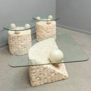 Eén salontafel en twee bijzettafels van mactansteen met glazen blad, mogelijk ontwerp Magnussen Ponte, Filipijnen, jaren '90 -gebruikssporen, chip van één bol van een bijzettafel-, 43 x 134 x 97 cm