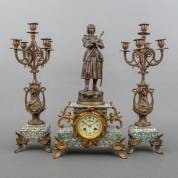 Driedelig pendulestel met metalen ornamenten en natuurstenen basementen, de pendule bekroond door een beeltenis van Jeanne d'Arc, gemerkt G. Omer, de twee vijflichts kandelabers met jongedame in vaasvormige voet, art nouveau -één arm van kandelaar gerepareerd, defecten-, 52 x 27 x 14 cm
