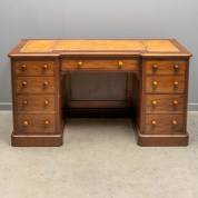 Mahonie bureau met bruin lederen blad en zeven lades, Engeland, circa 1900 -enkele scheuren in bovenblad-, 74 x 140 x 59 cm
