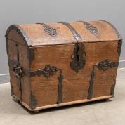 Eiken kist met gebogen deksel en smeedijzeren beslag, Hollands, vroeg 18e eeuw -gebruikssporen, geen sleutel aanwezig-, 53 x 67 x 39 cm