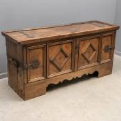 Grote eikenhouten dekenkist met smeedijzeren beslag in de vorm van bloemen, in het front vier panelen waarvan twee voorzien van ruiten, Nederlanden, 18e eeuw -defecten-, 75 x 156 x 55 cm