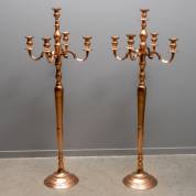 Paar grote vijflichts metalen kandelabers, modern -gebruikssporen, één met lakschade-, 142 Ø55 cm