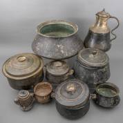 Diverse metalen kookpotten, pannen en een kan, 19e/20e eeuw -gebruikssporen-