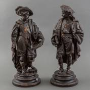 Paar gebronsd metalen beelden op houten basement, 20e eeuw -slijtage aan patina-, 51 x Ø 22 cm