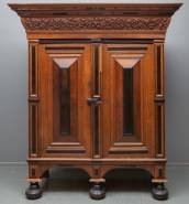 Eiken Gelderse kussenkast met ebben en palissander details, de kap met gestoken decor van cherubijnen en acanthusbladeren, staand op bolpoten, 17e/18e eeuw -restauraties in fineer-, 218 x 192 x 75 cm