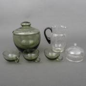 Donkergroene bowlschaal met deksel en drie kopjes, ontwerp Andries Dirk Copier, uitvoering Glasfabriek Leerdam, alle gemerkt, en bonbonschaaltje, ontwerp Cornelis de Lorm, uitvoering Glasfabriek Leerdam, gemerkt, daarbij: waterkan met bloemdecor -gebruikssporen-