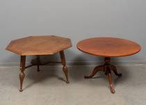 Rond mahonie tafeltje, en octagonaal eiken tafeltje, 61 x 92 x 92 cm