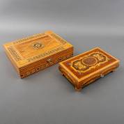 Houten bewaardoos met inlegwerk in diverse houtsoorten en parelmoer, Midden-Oosten, jaren '60, en houten juwelenkistje met muziekdoos 'Sole Mio', Sorrento, Italië, jaren '80 -interieur een beetje sleets-, 7 x 32 x 25 cm