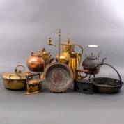 Divers messing en koper, waaronder: appelketel, strijkbout en schaal met beugel, 48 x Ø 32 cm