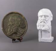 Witgelakte gipsen buste: Hendrik Conscience, naar ontwerp Hildebert Derre, daarbij: gipsen plaquette, Conscience, naar ontwerp J. Menten -enkele kleine beschadigingen-, 55 x 25 x 30 cm