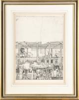 Ets: man aan het werk tussen allerlei machinerie en objecten, gemonogrammeerd in de druk RCS en gedateerd 1974, onduidelijk gesigneerd in potlood, 41,5 x 30,5 cm