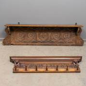 Eiken wandkapstok met gestoken decor van acanthusranken -sporen van oude houtworm-, en eiken wandplank met centraal decor van een tweekoppige adelaar -gebruikssporen, defect linksonder-, 48 x 158 x 20 cm