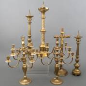 Vijf messing kandelaars: paar negenlichts kandelaars met vaasvormige stam, paar penkandelaars, en een kerkkandelaar met gedraaide stam, daarbij: crucifix aan staand messing kruis