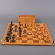Houten schaak-en-dambord met schaakstukken, midden 20e eeuw -gebruikssporen-, 54 x 54,5 cm