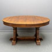 Ovale eiken coulissetafel op zuilvormige poten, 20e eeuw, met houten schuifsysteem en vier tussenbladen, lengte inclusief tussenbladen 388 cm -tussenbladen afwijkend-, 75 x 166 x 118 cm