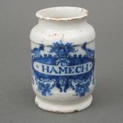 Delfts aardewerk apothekerspotje met blauw-wit opschrift: 'Hamech', 18e eeuw -defecten-, 12 x Ø 7 cm