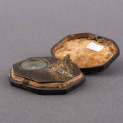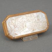 Achthoekige parelmoer tabaksdoos met verguld messing monturen, het deksel met gegraveerd decor van Helios, circa 1700 -enkele defecten aan parelmoer-, 2 x 12 x 6,5 cm