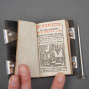 Almanach op 't jaar 1769. Voorsien met de jaar-, paarde-, beeste- en leermarkten. Amsterdam, Erfgen. van Wed. Corn. Stichter, (1768). 16 bladen gevolgd door 12 blanco bladen (waarvan 6 bladen gekalkt). 16mo. Haaieleer over houten platten, zilveren stiftsluiting, op de vier muiters het wapen van de familie Ockersen gesegt Steengracht, goud op snee. Aan het einde: 'Reys-wyzer', 'De oprechte Italiaanse Waarzegger op 1769', 'Korte kronyk 1711-1768'. (16 pp.)., 8 x 5,5 cm