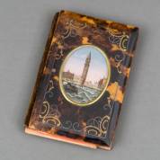 Schildpadbelijmd notitieboekje, de voorzijde met goud- en zilverkleurig arabeskmotief en afbeelding van Venetië, het potlood met benen knopje, 19e eeuw, 9,5 x 6,5 cm