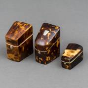 Drie schildpad doosjes met naaigerei: één met zilveren vingerhoedje en naalden in envelopje, één met drie diverse envelopjes met naalden, en één met zilverkleurig vingerhoedje, alle 19e eeuw -kleine defecten-
