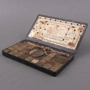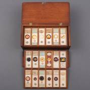 Mahonie preparatenkistje met twaalf lades en ieder met zes uiteenlopende dierlijke-, menselijke- en mineraalpreparaten, de meeste preparaten dragen een label van de firma R & J Beck, 921 Chestnut Street Philadelphia, eind 19e eeuw -gebruikssporen-, 9,5 x 22 x 10,5 cm